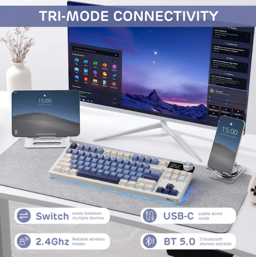 2.Tri-Mode Connectivity: Supports wired, 2.4G wireless, and Bluetooth connections, allowing simultaneous pairing with up to three Bluetooth devices for easy multi-platform switching.