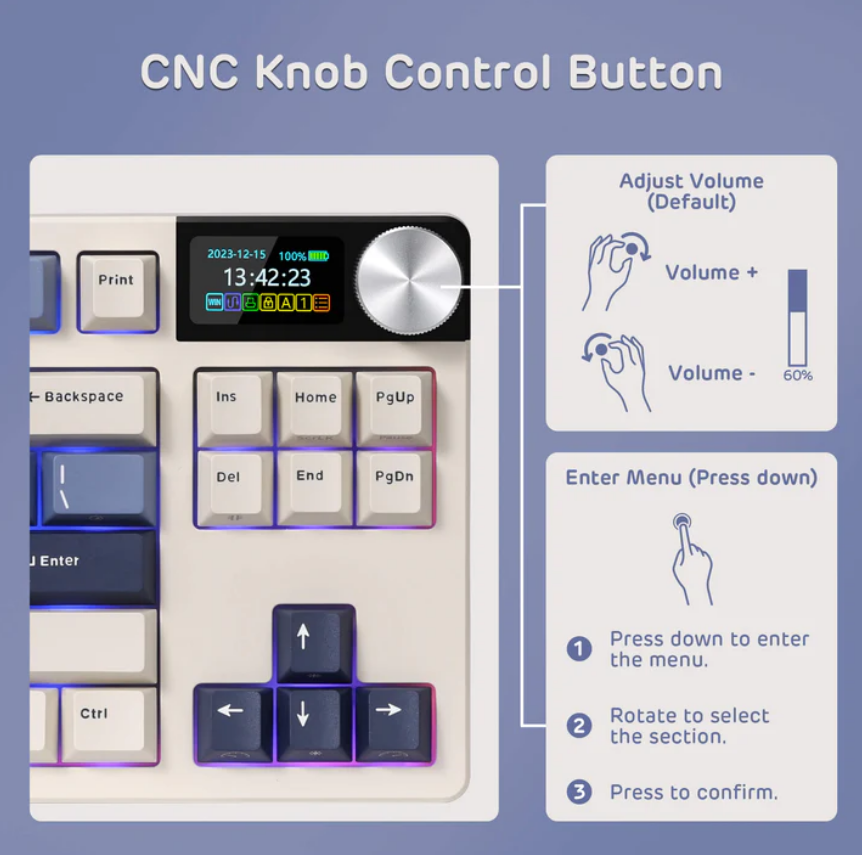 1.Smart Display & Metal Knob: Equipped with a smart display for status information and a premium metal knob with watch crown-like tactile feedback for quick adjustments of volume, lighting, and connection modes.