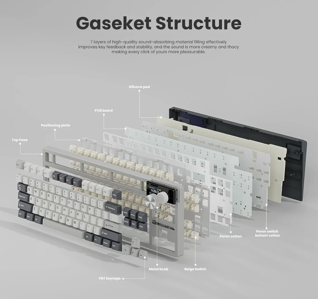 3.Gasket Mount Structure: Features a 5-layer filling design (including Poron foam, silicone pad, etc.) to effectively eliminate hollow sounds and provide a soft, consistent typing feel.