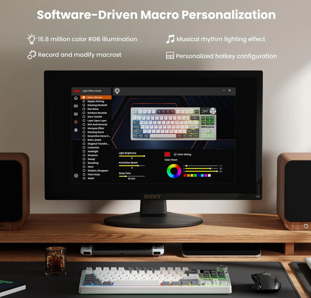 5.Vibrant RGB Backlighting: Offers multiple RGB backlight modes with 16.8 million colors, dynamic lighting effects, and music rhythm sync (HIFI Music Rhythm), all customizable via software.